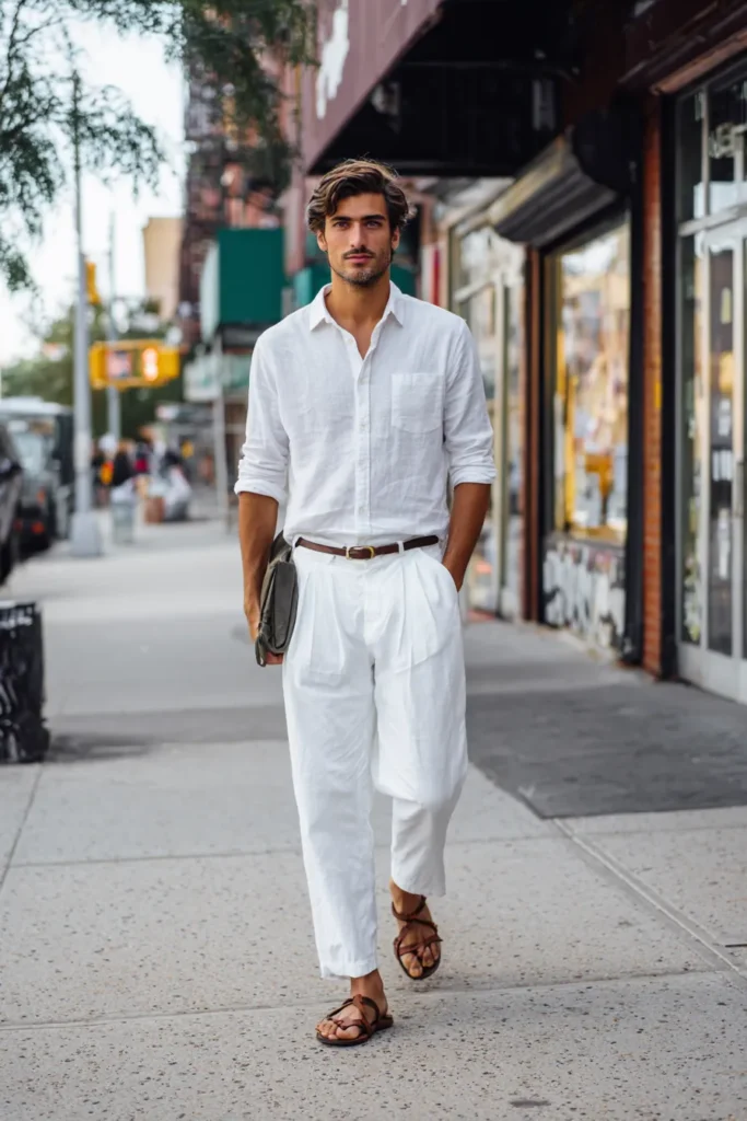 This is the perfect summer city-to-beach look, built around light, airy textures in dazzling white. He’s wearing a classic linen button-down shirt with the sleeves casually rolled up and a few buttons undone, giving it that wonderfully relaxed feel. The trousers are also white linen, featuring chic pleating and a comfortable wide cut that tapers slightly at the cropped hem, creating great movement. Rich, dark brown leather accessories, like the slim belt and the stylish strappy sandals, add a warm, earthy contrast that grounds the entire bright look.