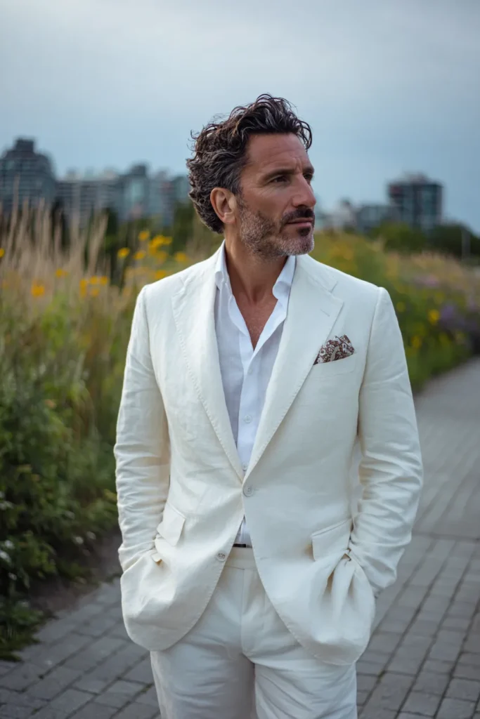 I think this outfit is absolutely fabulous because it masters that difficult balance between sharp tailoring and effortless summer style. The creamy color of the suit is so much more forgiving and warm than stark white, making it incredibly flattering on almost everyone. The way the shirt is unbuttoned shows just the right amount of casual confidence, and the choice of that subtly patterned pocket square is a stroke of genius. It’s a small detail that makes the whole outfit look instantly styled and expensive, perfect for a summer wedding guest or a date night out.