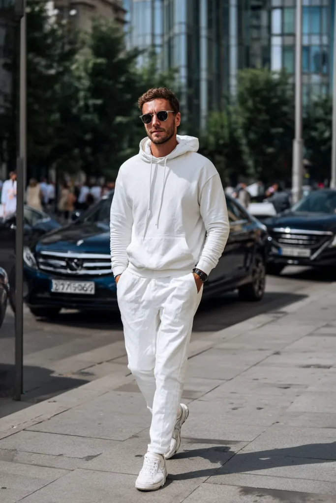 This look takes comfort to the next level by transforming simple athleisure into something incredibly chic and high-fashion. He’s rocking a matching set featuring an oversized, crisp white hoodie with clean lines and relaxed white joggers that look like a soft cotton blend, possibly linen-blend for a warmer day. The pure white palette is broken only by the sporty sneakers, which incorporate light grey and white elements, and his cool accessories. A pair of mirrored sunglasses and a dark-faced wristwatch add a strong, modern edge.
