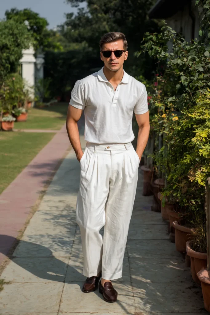 This outfit is giving off major elevated resort vibes, looking polished and perfectly suited for a sunny outdoor event. The top is a classic white polo shirt, tucked in and featuring a fantastic slim fit that looks structured and clean. He’s paired it with high-waisted, wide-leg trousers in an off-white linen or cotton blend, which have deep pleats that create a beautiful, relaxed drape. The whole bright look is anchored by rich, dark brown leather loafers, providing a necessary contrast, and he finishes it with cool, dark sunglasses.