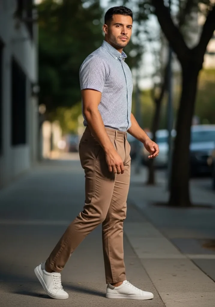 This outfit pairs slim brown chinos with a fitted short sleeve button down in a subtle micro print. The pants have a clean tailored line that tapers nicely at the ankle, giving a sharp silhouette without feeling stiff. Crisp white sneakers keep the look fresh and modern. The soft neutral brown tone balances the patterned shirt beautifully, creating an easy blend of relaxed and refined.