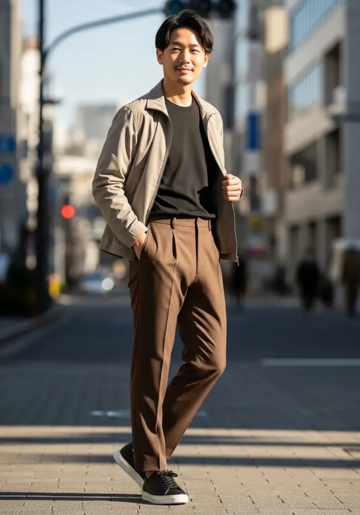 This look pairs relaxed brown pleated trousers with a sleek black T shirt and a lightweight beige jacket. The trousers have a soft drape through the leg, which gives movement and a slightly elevated feel. The pleats add structure without making the outfit look formal. Black low top sneakers keep it grounded and modern. The mix of warm brown and soft beige feels refined, while the black tee adds a cool contrast.