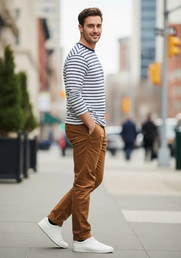 This outfit pairs slim brown chinos with a navy and white striped long sleeve tee for a fresh everyday look. The chinos have a clean tailored fit that tapers gently at the ankle, creating a sharp silhouette without feeling tight. The striped shirt adds a relaxed nautical vibe, while crisp white sneakers keep everything light and modern. The warm brown tone grounds the stripes beautifully and gives the outfit a refined finish.