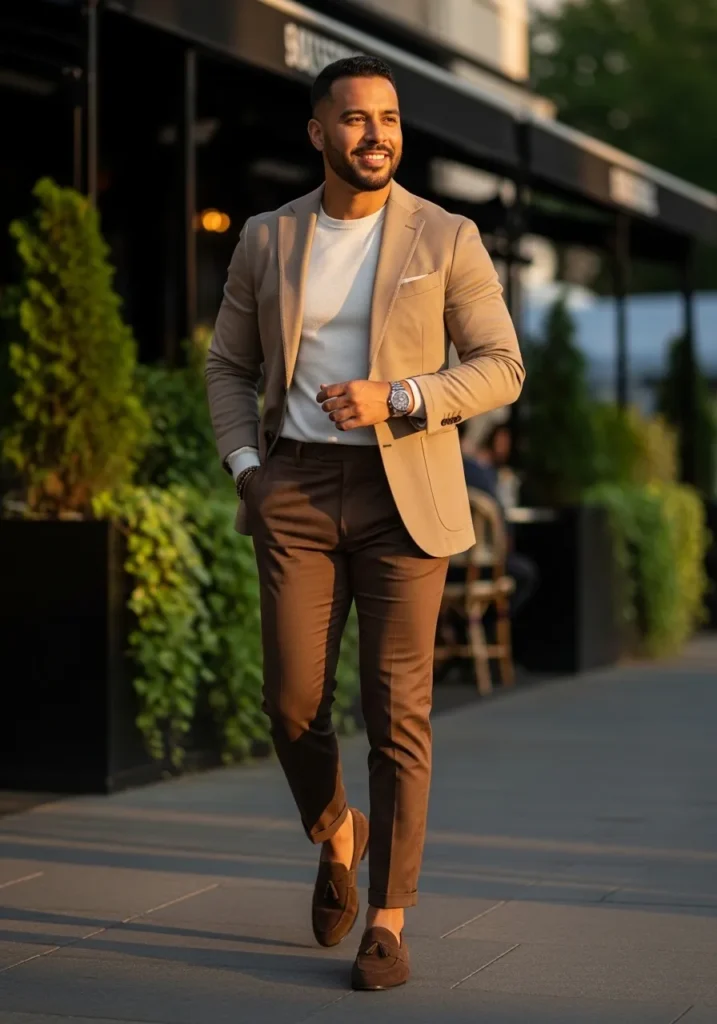 This outfit pairs slim tailored brown pants with a soft neutral T shirt and a sharp tan blazer. The trousers are neatly tapered with a slight crop at the ankle, which shows off rich brown suede tassel loafers. The blazer adds structure and polish, while the simple tee keeps everything relaxed and modern. The mix of warm browns and beige tones creates a smooth, cohesive palette that feels elevated but still easygoing.