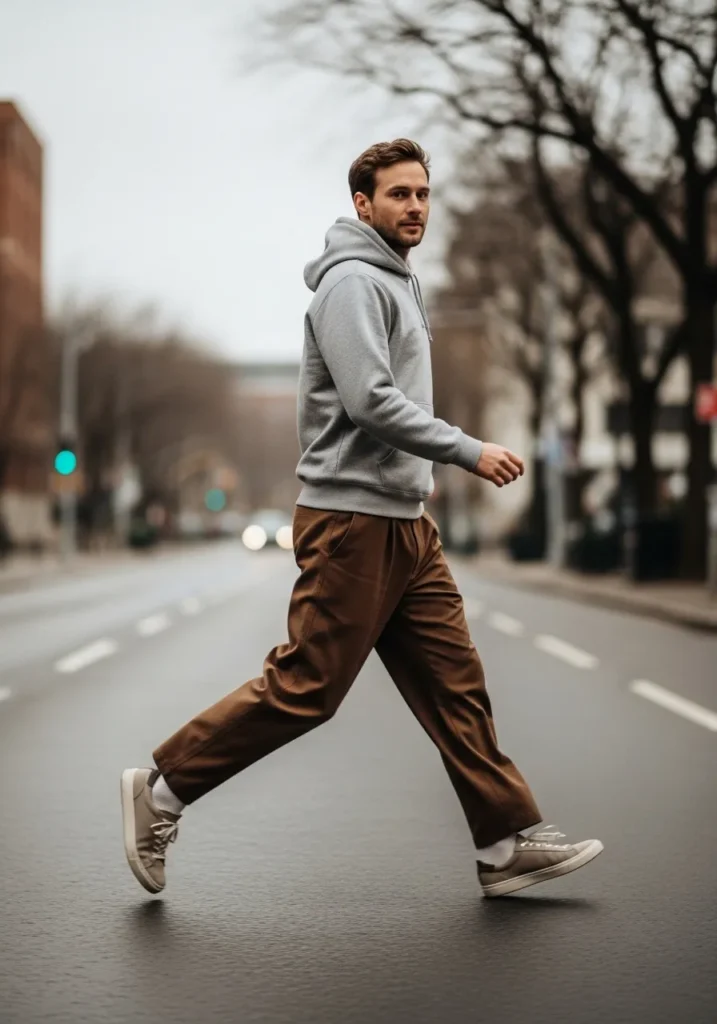 Relaxed Brown Pants with Classic Gray Hoodie