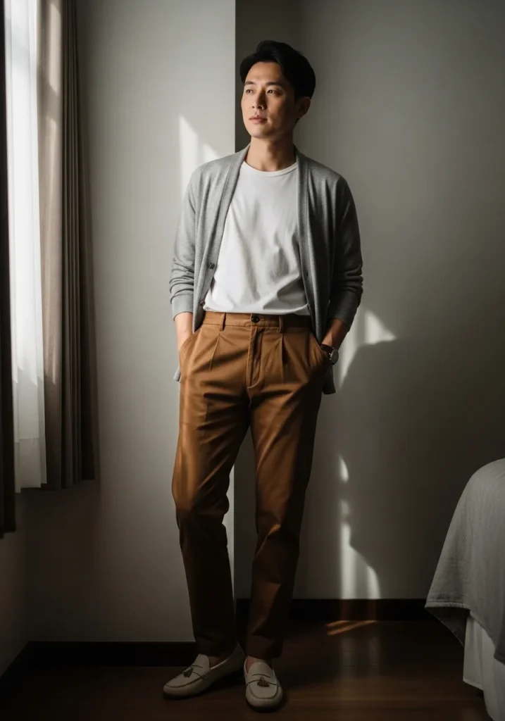 I love how effortless this combination looks. The pleated pants make it feel intentional, while the cardigan keeps it cozy and approachable. It is the kind of outfit that feels thoughtful without screaming for attention. If you are into men who look stylish in a subtle way, this is such a charming option. It feels flattering, balanced, and perfect for an easy dinner or a slow weekend afternoon.
