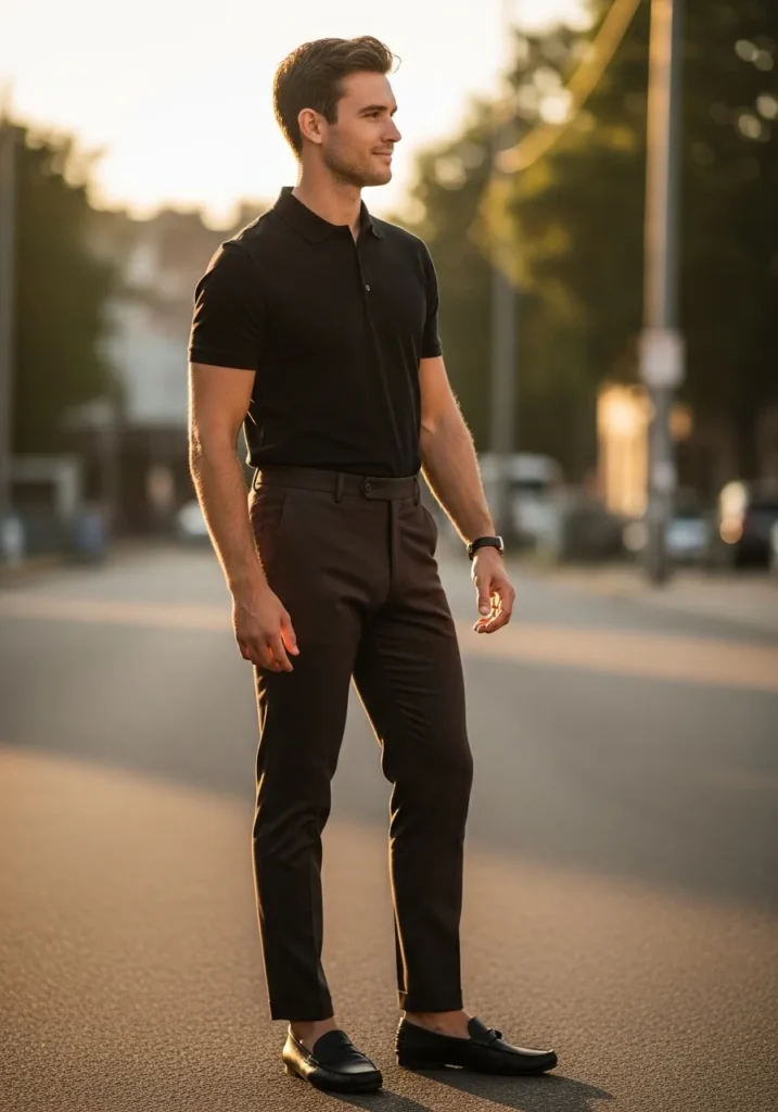 This outfit keeps things sleek with slim dark brown trousers paired with a fitted black polo shirt. The trousers have a sharp tailored cut that sits cleanly at the ankle, creating a long streamlined line through the leg. The black polo adds a refined sporty touch while still looking polished. Black loafers finish the look with a smooth minimalist feel. The overall vibe is modern, confident, and slightly elevated without feeling dressy.