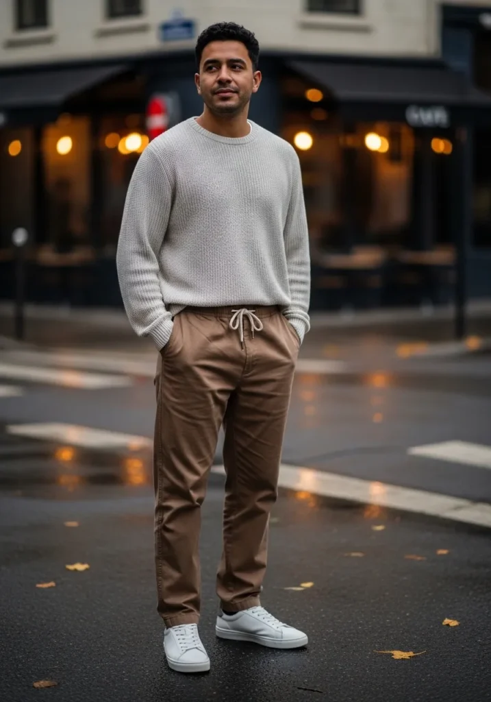 This look combines relaxed brown drawstring pants with a soft textured cream sweater for an easy yet refined vibe. The trousers have a tapered fit with a comfortable elastic waist and subtle tailoring through the leg. The cream knit adds cozy texture and lightens up the rich brown tone beautifully. Clean white sneakers finish the outfit and keep it modern and fresh. The overall feel is relaxed city style with a polished twist.