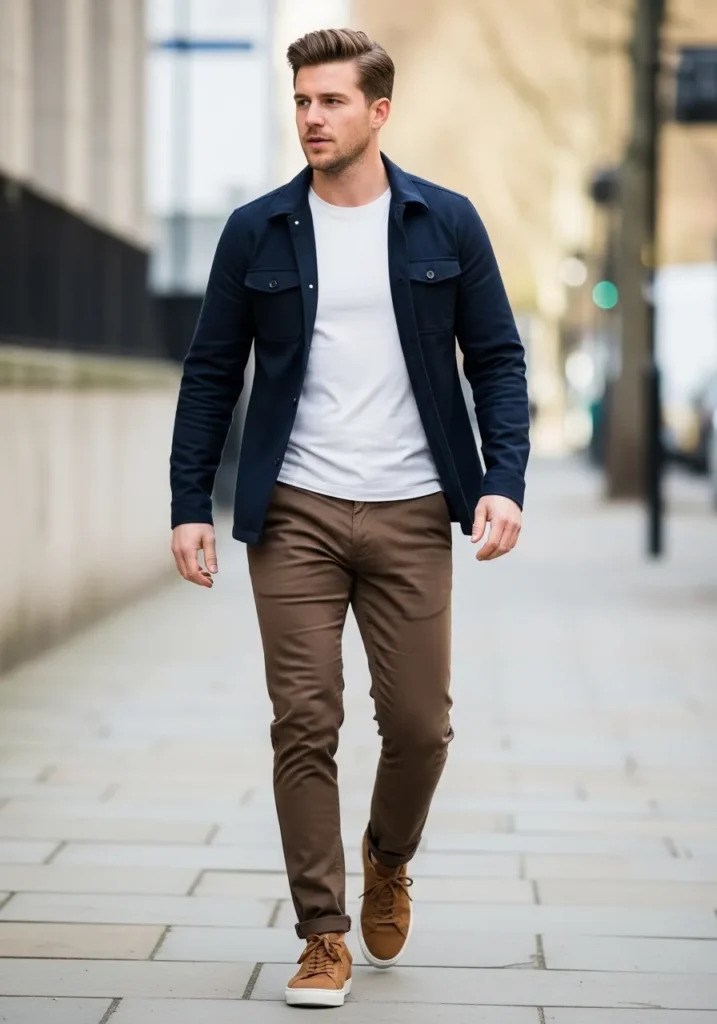 This outfit mixes slim brown pants with a crisp white T shirt and a structured navy overshirt. The pants have a tailored fit that follows the leg cleanly without looking tight, and the warm brown shade pairs beautifully with the deep navy layer. Tan suede sneakers add texture and keep the look grounded and casual. Everything feels streamlined and modern, like a polished version of everyday street style.