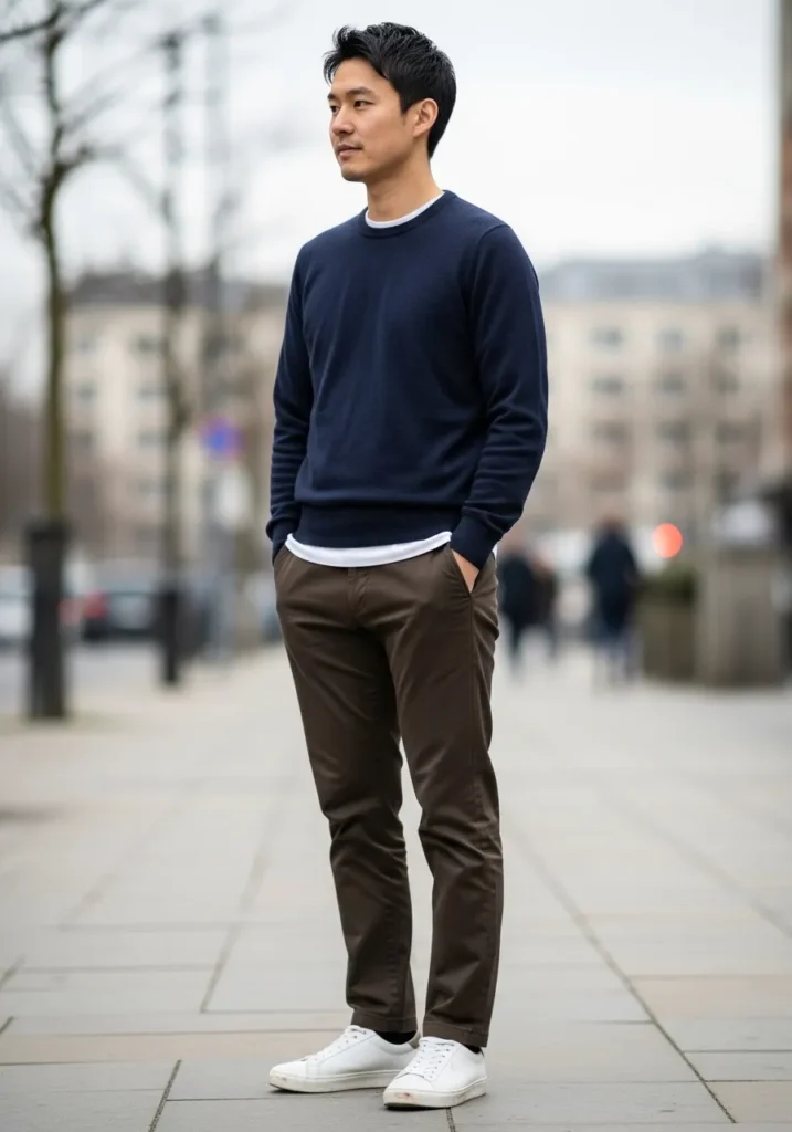 This look keeps things clean and classic with slim brown trousers paired with a navy crewneck sweater layered over a crisp white T shirt. The brown pants are tailored but not tight, with a smooth cotton finish that gives a polished feel without looking stiff. The navy knit adds depth and contrast, while the white sneakers keep everything fresh and modern. The overall vibe feels relaxed, city ready, and quietly confident.