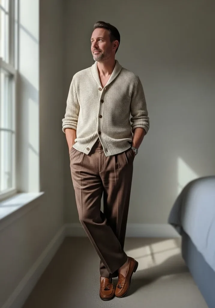 This look feels soft, refined, and quietly confident. He is wearing relaxed brown dress pants with subtle pleats and a smooth drape that falls beautifully through the leg. The trousers are paired with a chunky cream knit cardigan featuring a shawl collar and warm wooden buttons. The texture of the knit adds depth and makes the outfit feel inviting. Brown leather tassel loafers finish the look and echo the richness of the pants. The whole vibe is calm, mature, and effortlessly elegant.
