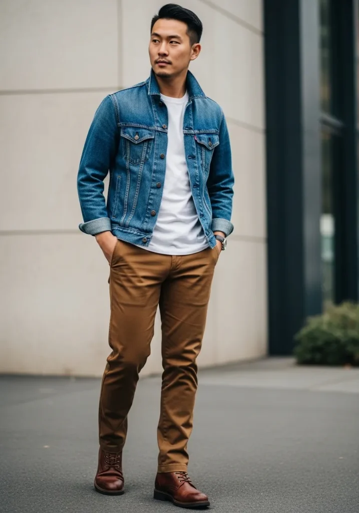 This outfit feels like a modern classic you can wear on repeat. He is wearing slim brown pants with a clean tailored fit that keeps everything sharp through the leg. On top, a simple white T shirt keeps the base fresh and minimal. The medium wash denim jacket adds structure and that timeless rugged touch we all love. Brown leather lace up boots bring weight to the look and tie in perfectly with the trousers. The overall vibe is relaxed, masculine, and easy to style.