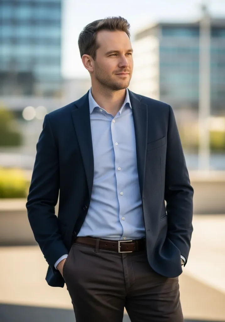 This outfit is classic office style done right. He is wearing dark brown tailored pants with a clean slim cut that keeps the look sharp and streamlined. The trousers are paired with a light blue button down shirt that feels fresh and professional. A navy blazer adds structure and depth, creating that timeless smart combination. The brown leather belt ties neatly into the pants, keeping everything cohesive and polished. The overall vibe feels confident, refined, and ready for business without looking stiff.