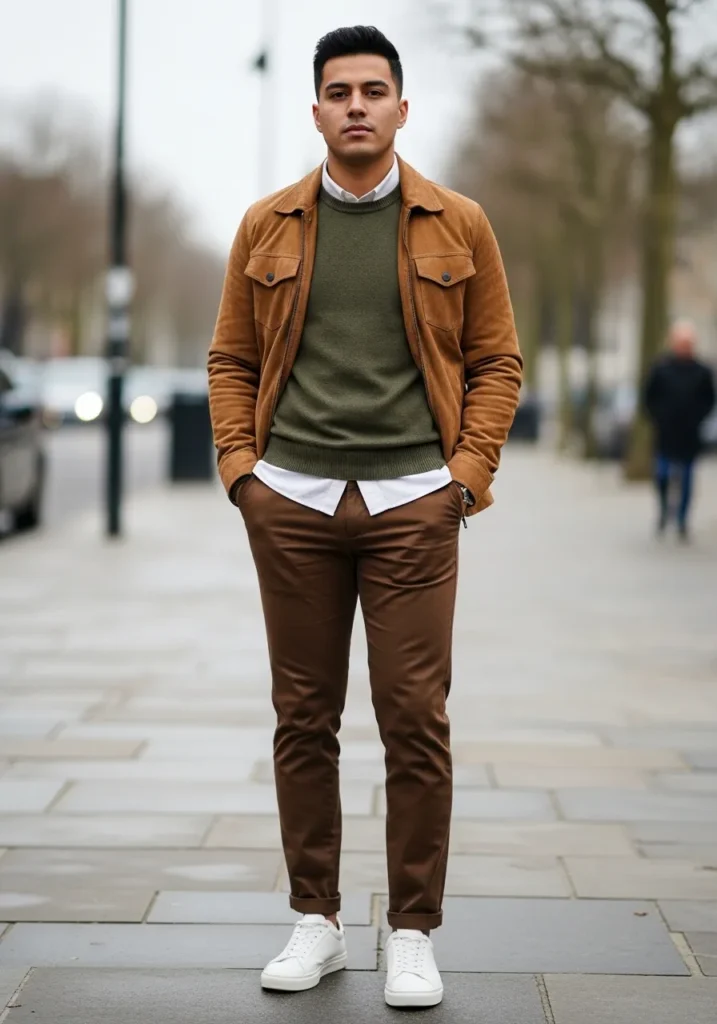 This outfit feels balanced and easy in the best way. He is wearing slim brown trousers with a clean cuff at the ankle, giving the look a tailored but relaxed finish. On top, a crisp white shirt peeks out under an olive green sweater, adding subtle layering and depth. A tan suede style jacket sits over everything and ties the earthy tones together beautifully. White minimalist sneakers keep the outfit fresh and modern. The overall vibe feels casual, thoughtful, and quietly put together.