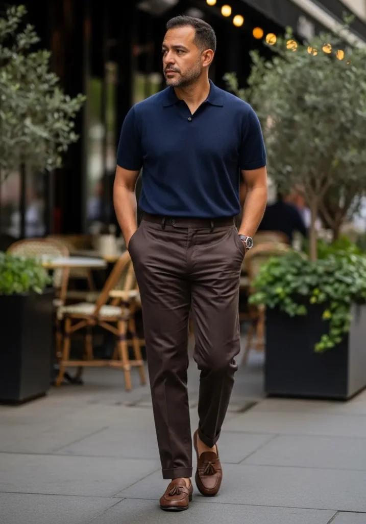 This look is simple but incredibly sharp. He is wearing dark brown tailored pants with a slim cut and a clean cuff at the hem, giving the outfit a polished foundation. The fabric looks smooth and structured, which keeps the silhouette refined. On top, a fitted navy polo adds a relaxed yet elevated feel. Brown leather tassel loafers complete the outfit and echo the richness of the trousers. The overall vibe feels sophisticated, effortless, and perfect for a smart casual day out.