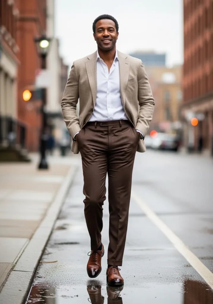 This outfit feels polished and confident in the most effortless way. He is wearing rich brown tailored dress pants with a slim fit that creates a clean line from waist to ankle. The fabric has a subtle sheen that gives the trousers a refined finish. On top, a light blue button down shirt keeps the look crisp and fresh. A beige blazer adds softness and warmth, making the color palette feel balanced and elevated. Brown leather oxford shoes tie everything together beautifully.