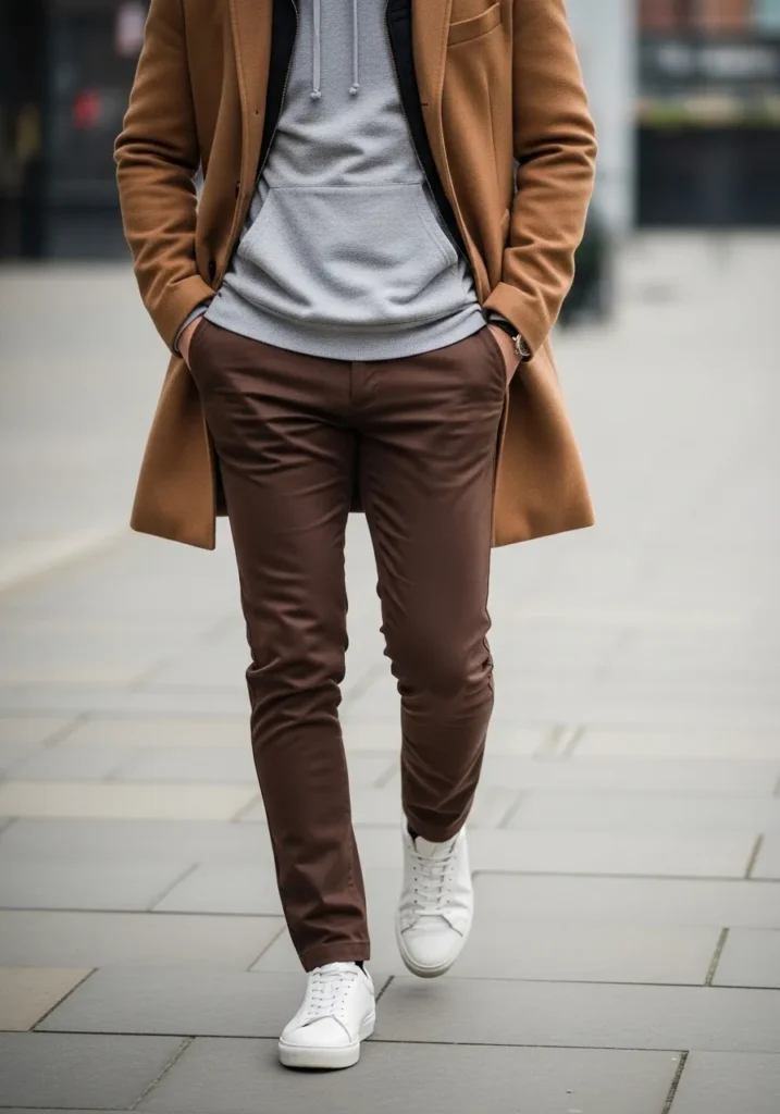 This outfit mixes smart and casual in such a smooth way. He is wearing slim brown trousers with a sleek tailored fit that keeps the base polished. The pants have a subtle sheen that makes them feel elevated rather than basic. On top, a soft gray hoodie adds a relaxed and modern layer. A camel overcoat sits over everything and brings structure and warmth to the look. Clean white sneakers keep it fresh and easy. The overall vibe feels urban, confident, and perfectly balanced between dressed up and laid back.