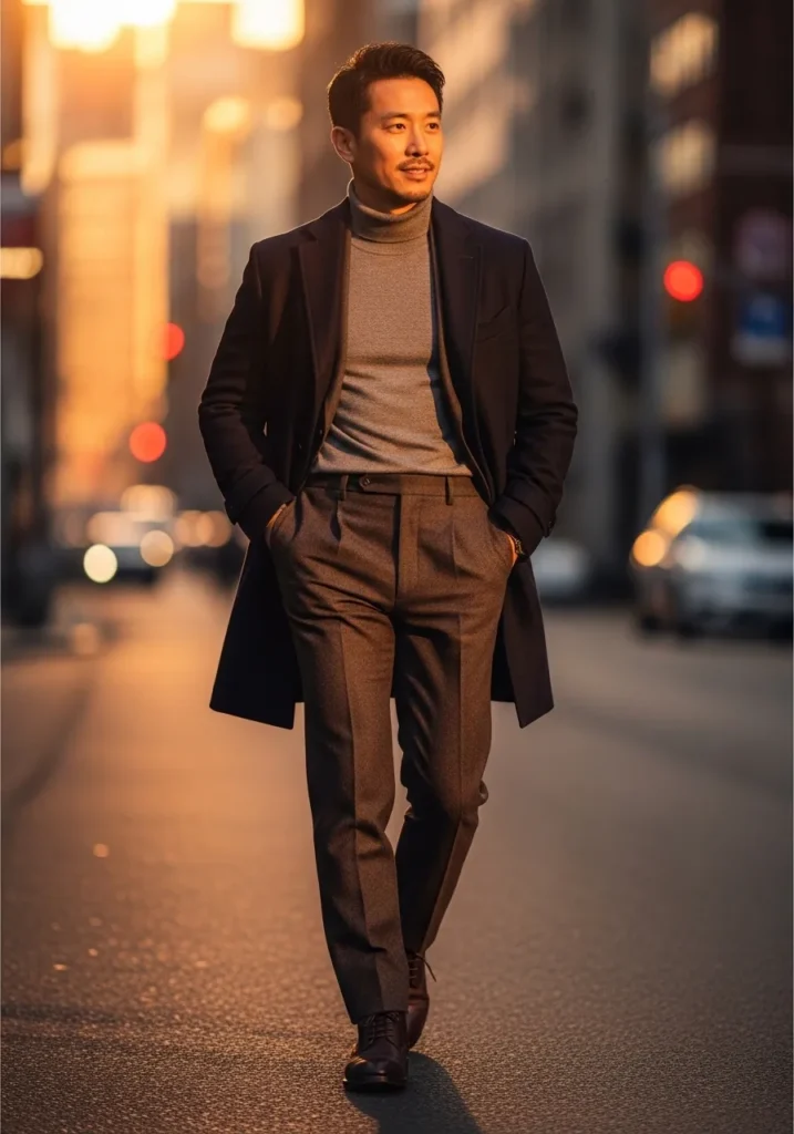 I love how the neutral layers make the brown trousers feel rich and elevated. The turtleneck adds sophistication without trying too hard, and the overcoat instantly upgrades everything. It feels like one of those outfits that turns heads in a subtle way. If you are into men’s style that looks mature and refined but still modern, this combination is such a beautiful go to.