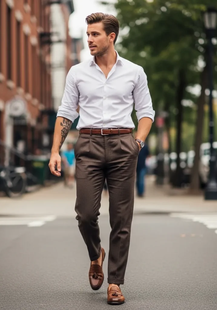 This outfit is classic in the best way. He is wearing slim tailored brown trousers with a clean cuff at the ankle, paired with a fitted white button down shirt with the sleeves casually rolled up. The rich brown leather belt and matching tassel loafers pull everything together beautifully. The fabric of the trousers looks smooth and structured, giving that sharp silhouette through the leg. The overall vibe feels confident, city polished, and effortlessly put together.