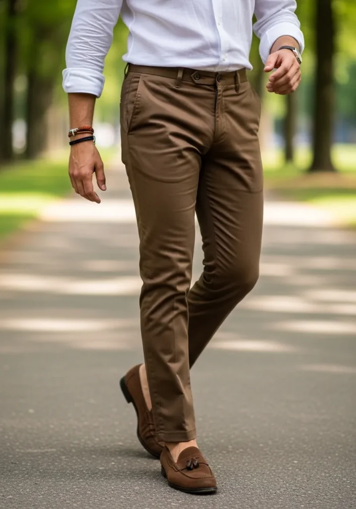 This look keeps things timeless and sharp. He is wearing slim brown trousers with a smooth tailored fit that follows the leg cleanly. The fabric has a subtle sheen that makes the pants feel elevated rather than basic. A crisp white button down shirt with the sleeves casually rolled up adds freshness and contrast. Brown suede tassel loafers complete the outfit and echo the warm tone of the trousers. The overall vibe feels classic, confident, and effortlessly polished.