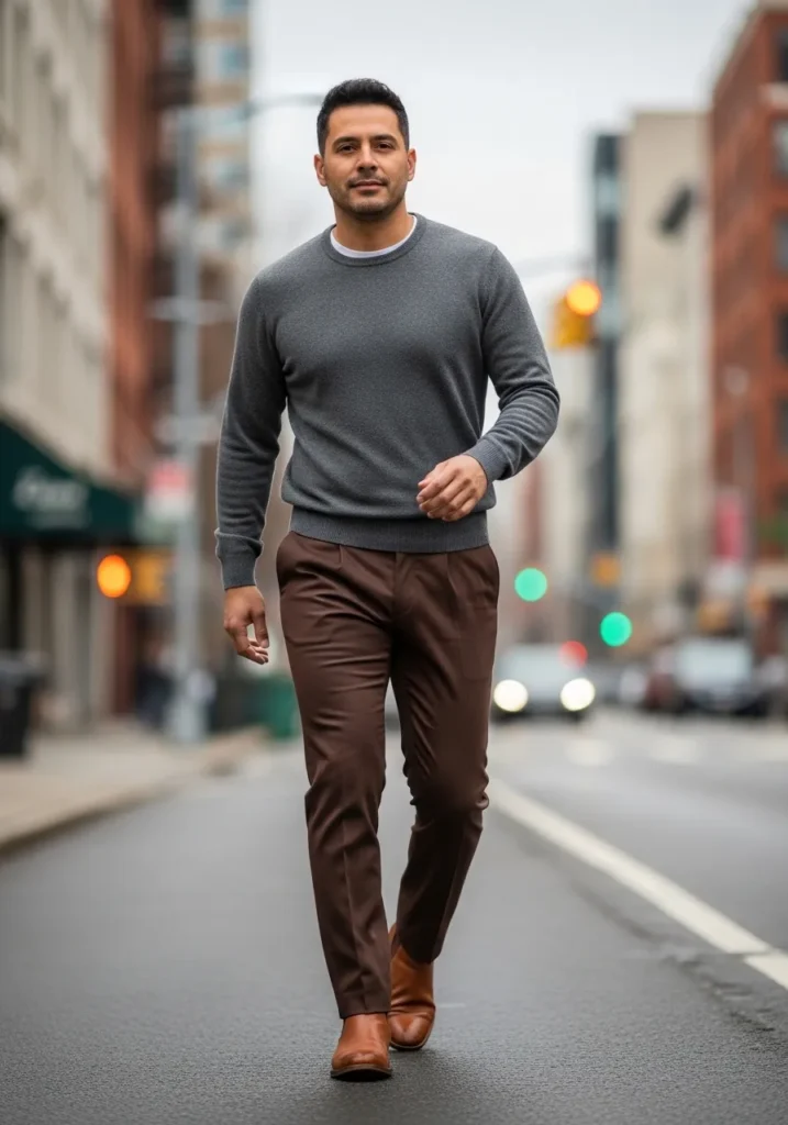 Gray Sweater with Deep Brown Slim Trousers