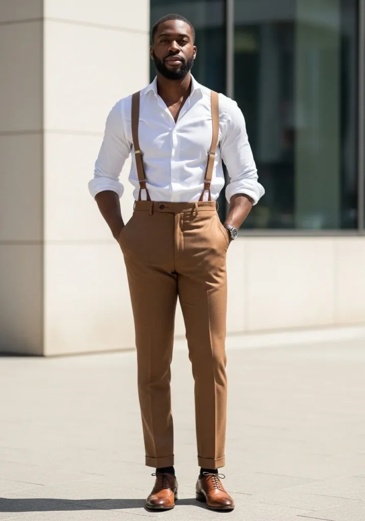 I love how suspenders instantly elevate a simple white shirt and brown pants combo. It feels thoughtful and refined without being costume like. The fitted trousers make the whole outfit look flattering and well balanced. If you appreciate timeless style with a little personality, this is such a strong option. It looks charming and confident in that effortless way we all secretly love.