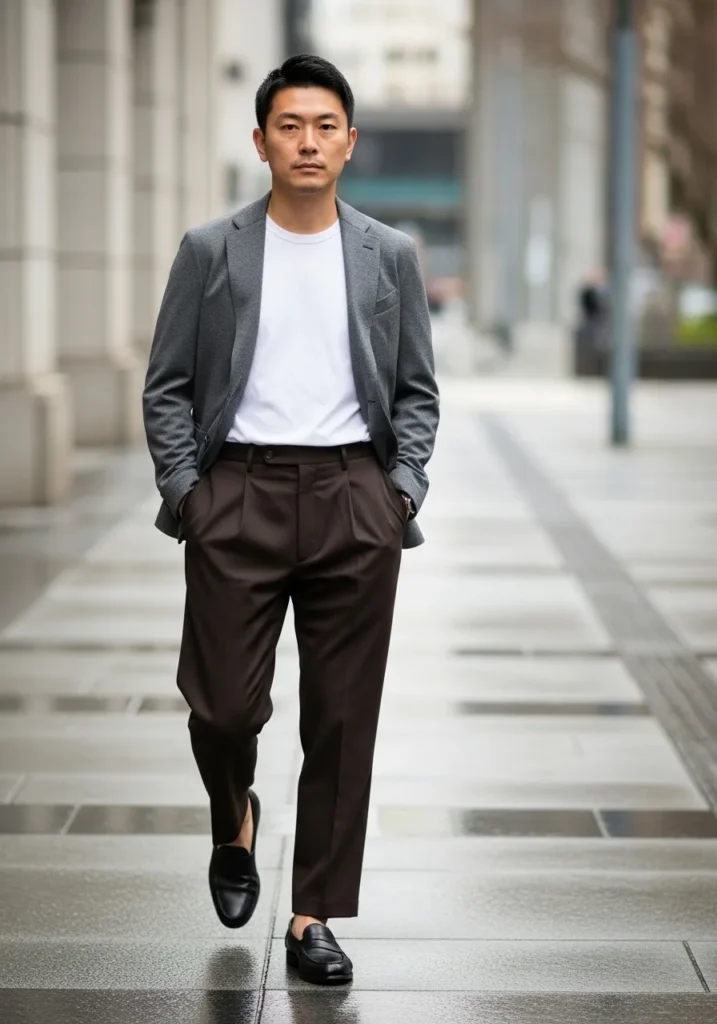 This outfit leans into clean lines and modern simplicity. He is wearing dark brown tailored trousers with a slightly relaxed straight fit that looks polished but not stiff. The pants have a smooth finish that gives them a refined edge. On top, a crisp white crewneck tee keeps things fresh and unfussy. A structured gray blazer adds that smart layer without feeling too formal. Black leather loafers complete the look and keep it sleek and city ready. The overall vibe feels contemporary, calm, and quietly confident.