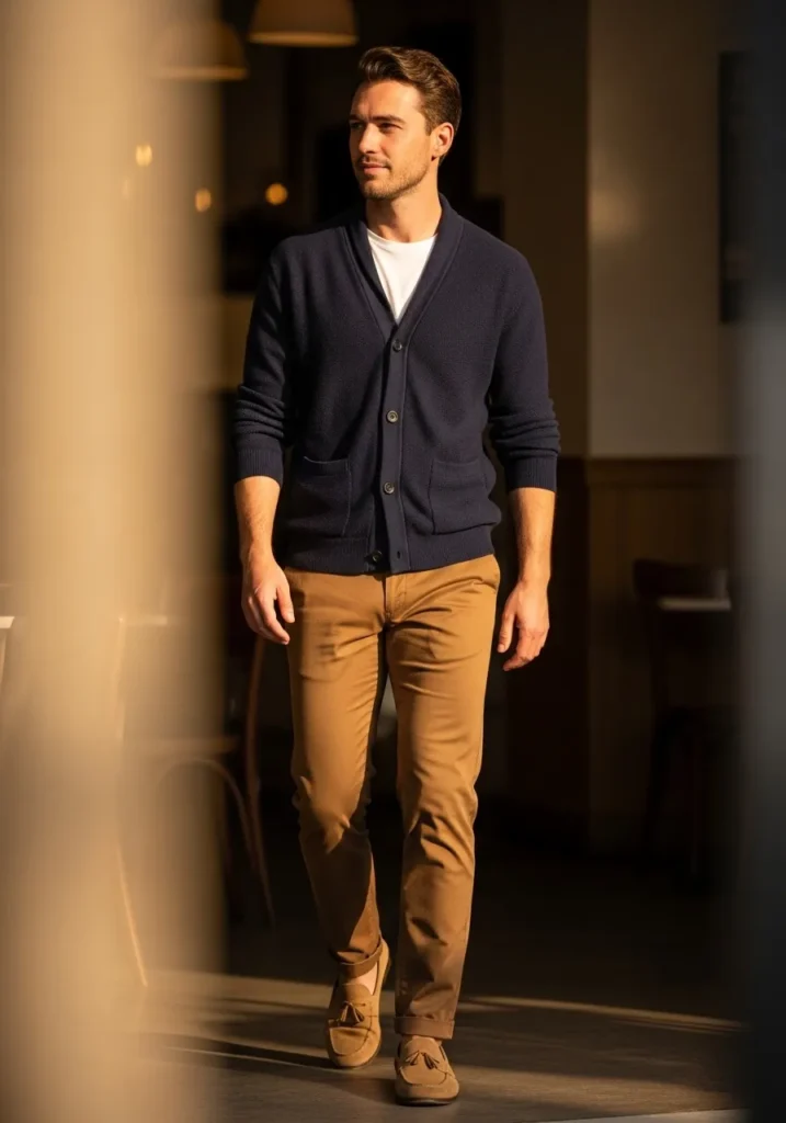This look feels cozy but still completely put together. He is wearing warm brown slim fit pants with a clean tailored cut that keeps the silhouette sharp. The fabric looks smooth and slightly structured, which elevates the entire outfit. On top, a navy buttoned cardigan adds depth and softness, layered over a simple white crewneck tee for contrast. Brown suede tassel loafers tie everything together and echo the tone of the trousers. The overall vibe is relaxed, polished, and quietly sophisticated.
