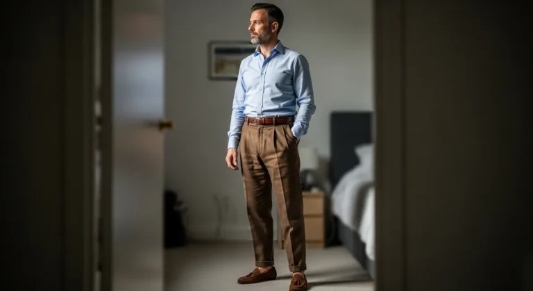 I love how the light blue and warm brown play off each other. It feels classic but not predictable. The pleats give the trousers more personality and structure, which makes the whole outfit look more elevated. If you are into men’s style that feels timeless yet current, this is such a good reference. It looks flattering, sharp, and like he knows exactly what he is doing without trying too hard.