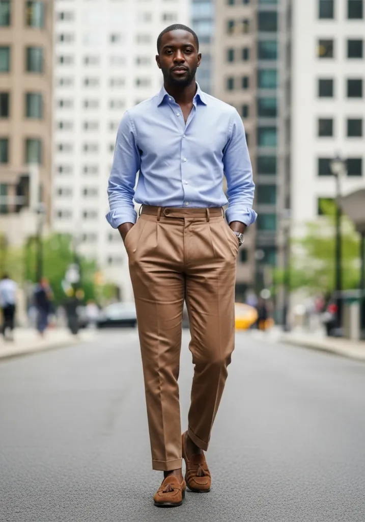This outfit feels refined but still very wearable. He is wearing tailored brown pleated trousers with a slightly higher waist and a clean cuff at the hem. The soft pleats add shape and a touch of vintage charm. On top, a fitted light blue button down shirt keeps the look fresh and crisp. The sleeves are casually pushed up, and brown suede tassel loafers tie everything together in the most polished way. The overall vibe is confident, modern gentleman with a relaxed edge.