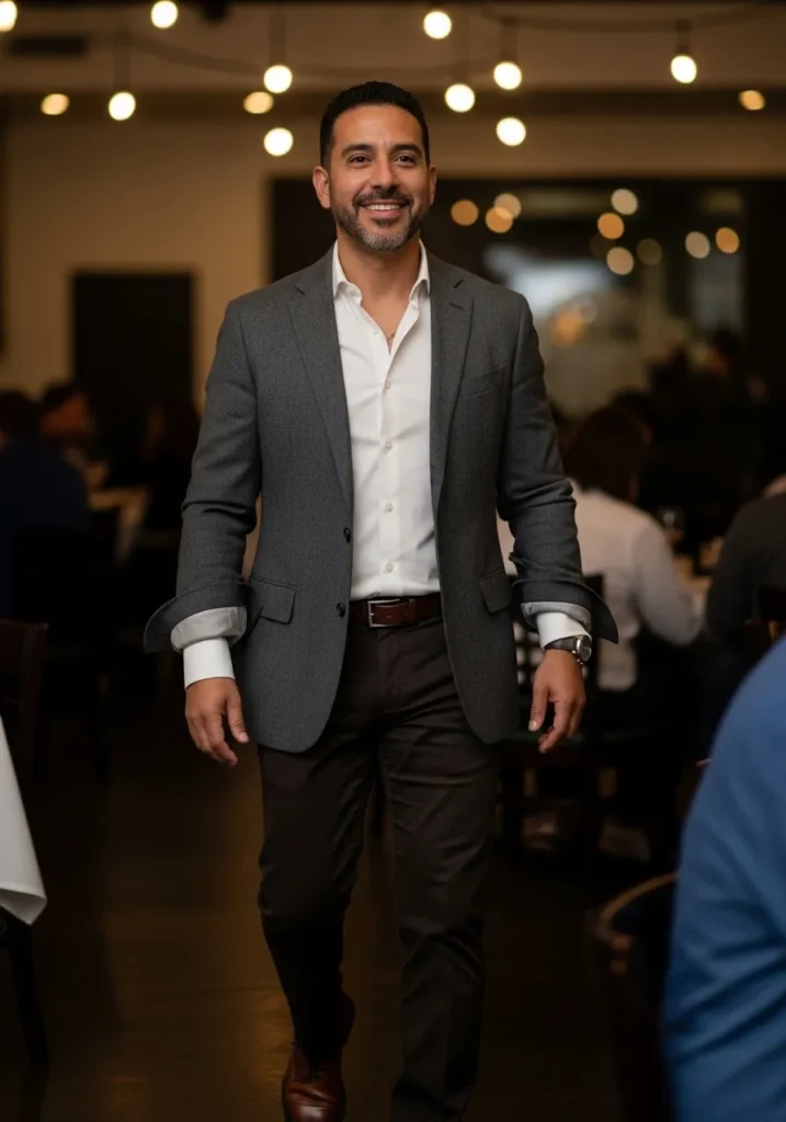 This look is pure evening polish. He is wearing deep brown tailored dress pants with a smooth finish that catches the light just slightly. The trousers are paired with a crisp white button down shirt worn open at the collar for a relaxed touch. On top, a structured gray blazer sharpens the whole silhouette. Brown leather dress shoes and a matching belt tie everything together seamlessly. The overall vibe feels refined, confident, and ready for a nice dinner or event.