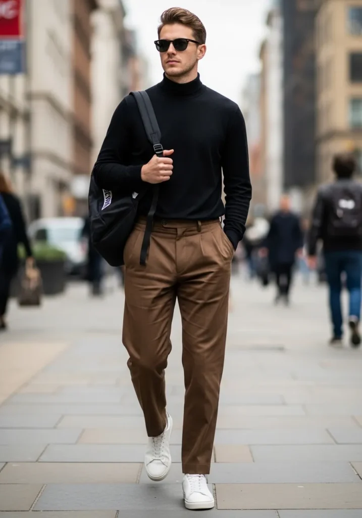 This outfit feels sleek and city ready in the best way. He is wearing tailored brown trousers with a clean slim fit and a smooth finish that gives them a refined look. On top, a fitted black turtleneck keeps the silhouette sharp and streamlined. Crisp white sneakers add contrast and keep the outfit grounded in everyday style. The black backpack and dark sunglasses give it that effortless street vibe without overpowering the clean lines of the outfit.