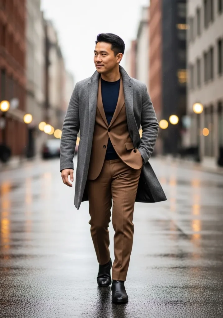 This look is classic layering done beautifully. He is wearing slim brown tailored trousers with a matching brown blazer, creating a coordinated suit moment that feels rich and refined. Underneath, a dark navy knit adds depth and contrast without stealing attention. On top, a structured gray overcoat sharpens the silhouette and makes the whole outfit feel city ready. Black leather boots ground the look and add a sleek finish. The mix of brown, gray, and navy feels intentional and elevated.