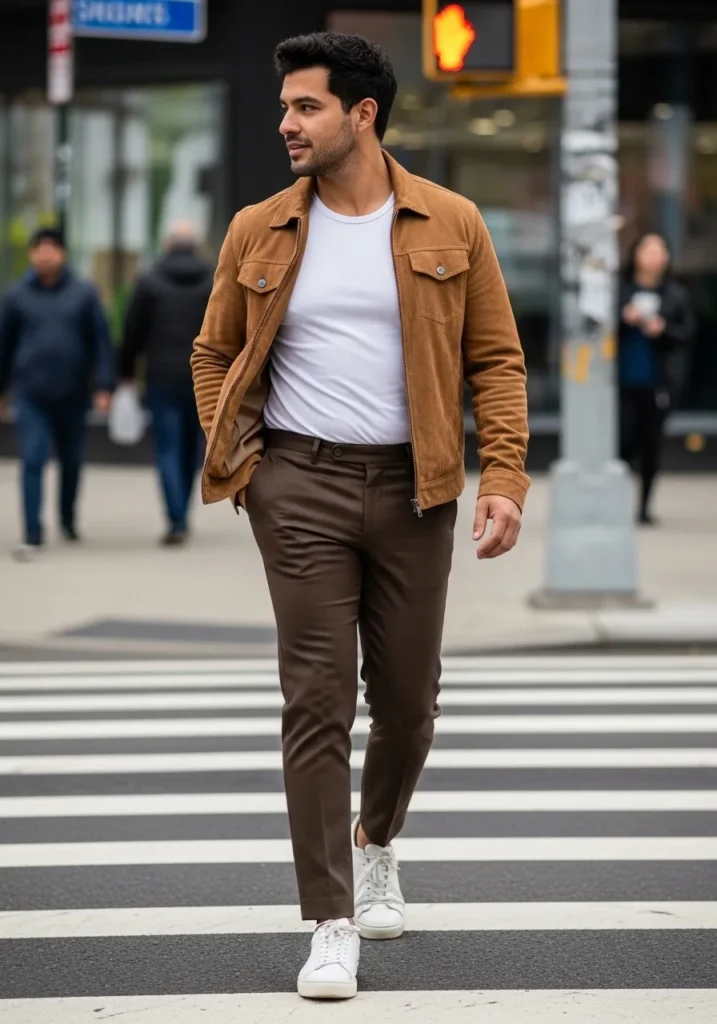 This outfit feels like everyday city style done right. He is wearing dark brown slim trousers with a smooth tailored fit that keeps the silhouette sharp. On top, a simple white fitted T shirt keeps the base clean and minimal. The tan suede style jacket adds warmth and texture, giving the whole look more depth. Crisp white sneakers finish it off and keep everything feeling fresh and modern. The overall vibe is relaxed, confident, and effortlessly cool.