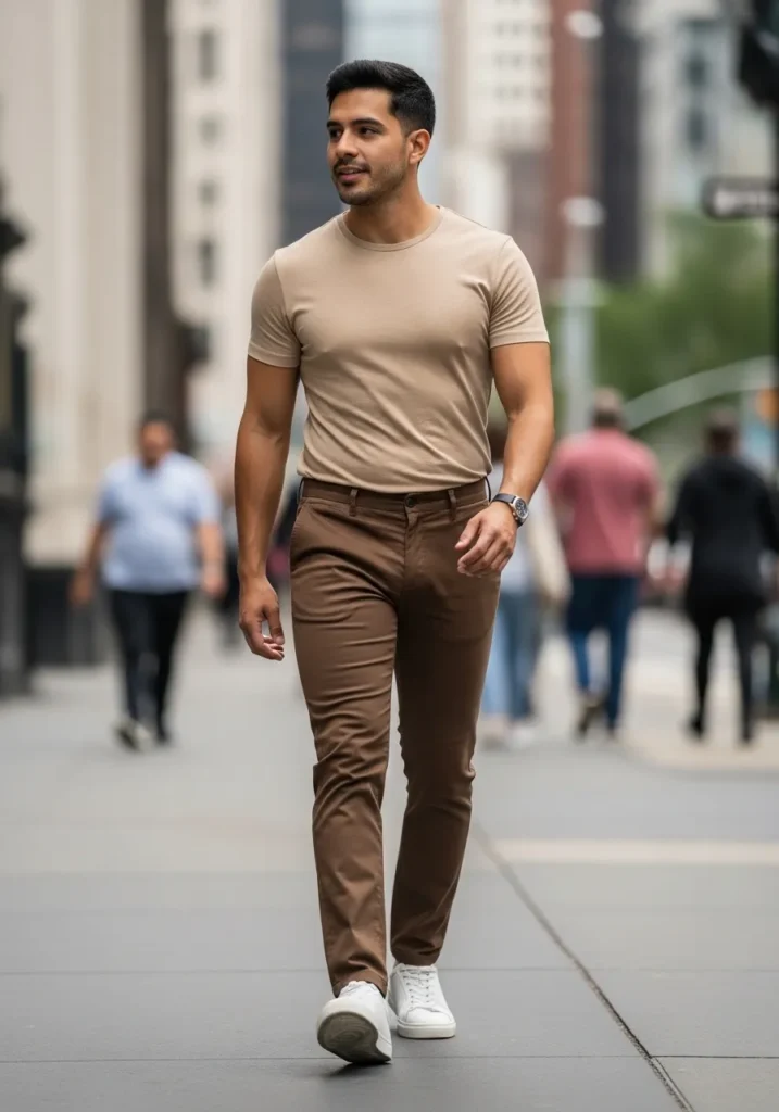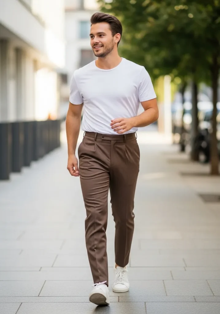 This outfit keeps things clean and modern with slim brown trousers and a fitted beige crew neck T shirt. The pants have a smooth tailored finish with subtle natural folds that make them feel wearable and not stiff. The warm brown tone pairs effortlessly with the soft neutral top. Fresh white sneakers add a crisp contrast and keep the whole look relaxed and city ready.