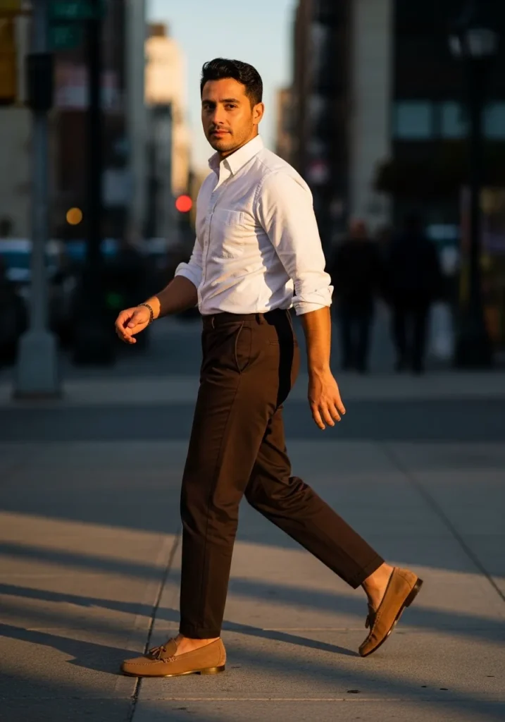 This outfit leans into timeless style with dark brown slim fit trousers and a crisp white button down shirt. The shirt is neatly tucked in with the sleeves slightly rolled for a relaxed touch. The trousers have a clean tapered cut that follows the leg smoothly with subtle natural folds as he walks. Tan suede loafers finish the look and bring a warm softness that complements the deep brown beautifully.