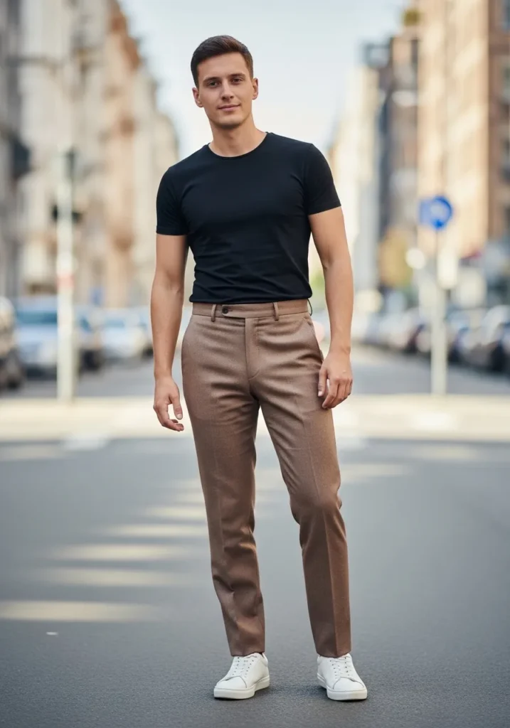 This look keeps it clean and modern with light brown tailored trousers and a sleek black fitted T shirt. The pants have a sharp tapered cut that falls straight with soft natural folds through the leg. The smooth fabric gives them a polished finish without looking stiff. Crisp white sneakers add contrast and keep the outfit grounded in that easy everyday space. The overall vibe feels minimal, confident, and quietly sharp.