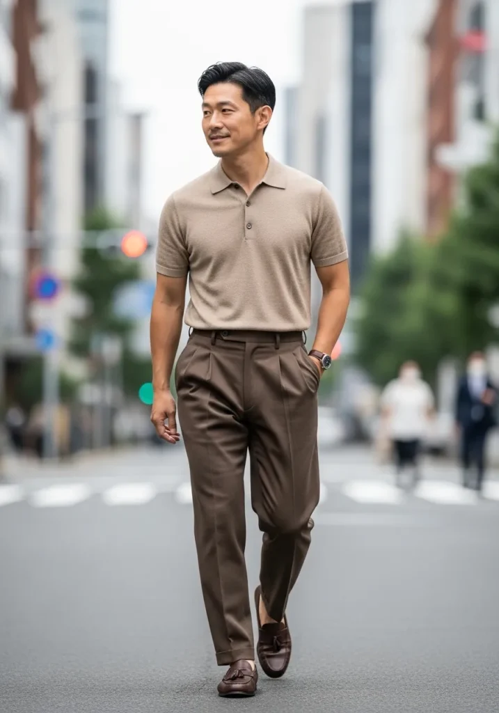 This outfit feels refined but still relaxed in the best way. He is wearing rich brown pleated trousers with a clean tailored cut that drapes smoothly down the leg. The subtle pleats add shape and a bit of classic structure without looking old fashioned. On top, a soft taupe knit polo brings warmth and texture, tucked in neatly for a polished finish. Dark brown leather loafers complete the look and tie everything together beautifully.