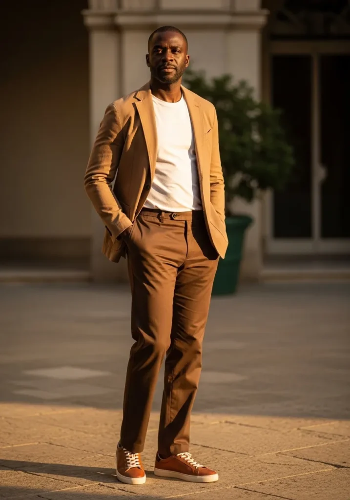 This outfit mixes tailored structure with relaxed ease in such a smooth way. He is wearing slim brown trousers with a neat straight cut and soft natural folds through the leg. A crisp white crew neck tee keeps the base simple and fresh. Over it, a camel blazer adds warmth and polish without feeling stiff. Brown leather sneakers finish the look and keep it grounded in everyday wear instead of formal territory.