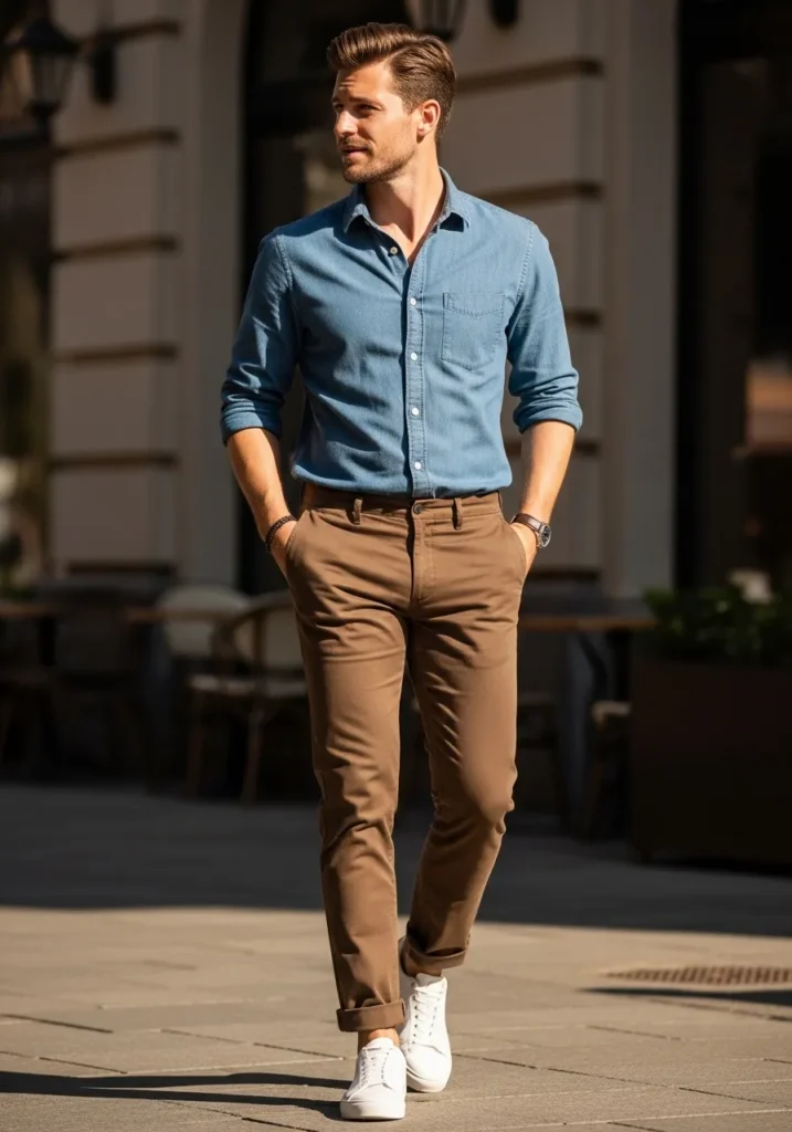 This look blends casual charm with clean tailoring so effortlessly. He is wearing slim brown chinos with a neat cuff at the ankle, giving the outfit a slightly relaxed feel. The fabric has soft natural folds that keep it looking real and wearable. A fitted blue denim button down adds texture and contrast, tucked in for a sharp silhouette. Crisp white sneakers finish the look and bring that fresh modern touch we all love.