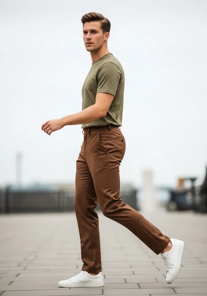 This outfit keeps things simple but striking with slim brown tailored trousers and a fitted olive green T shirt. The pants have a smooth finish with clean lines and subtle natural folds as he moves. The rich brown tone pairs beautifully with the earthy green, creating a warm and grounded color story. Crisp white sneakers add a fresh contrast and keep the look modern and relaxed.