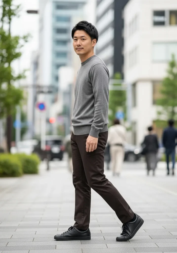 This look leans into clean lines and subtle contrast. He is wearing dark brown slim fit trousers with a smooth tailored finish and gentle natural folds along the leg. The deep brown tone feels rich and polished. On top, a fitted charcoal gray sweater keeps the silhouette sleek and streamlined. Black leather sneakers complete the outfit and add a modern city edge without overpowering the simplicity.