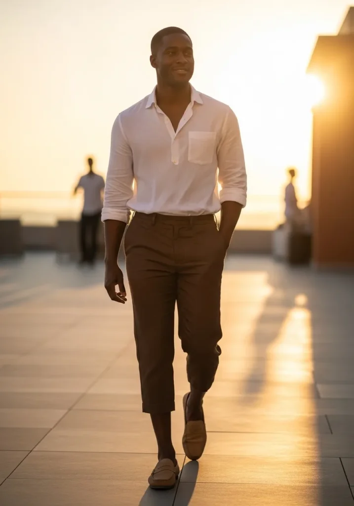 I always love a white shirt and brown pants moment because it feels timeless but never boring. The contrast is clean and flattering, and it instantly makes the whole outfit look intentional. It gives confident grown man energy in the best way. If you are helping someone build a wardrobe that feels polished without being stiff, this combination is such a smart place to start. It is simple, elegant, and quietly impressive.