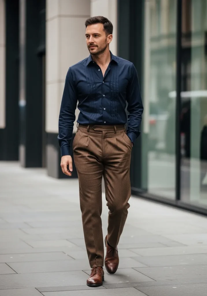 This outfit leans polished and refined with a deep navy dress shirt tucked neatly into tailored brown trousers. The pants have a subtle texture that adds dimension while still keeping a clean silhouette. They fall straight with soft natural folds that move easily as he walks. Brown leather dress shoes complete the look and echo the richness of the trousers for a cohesive finish.