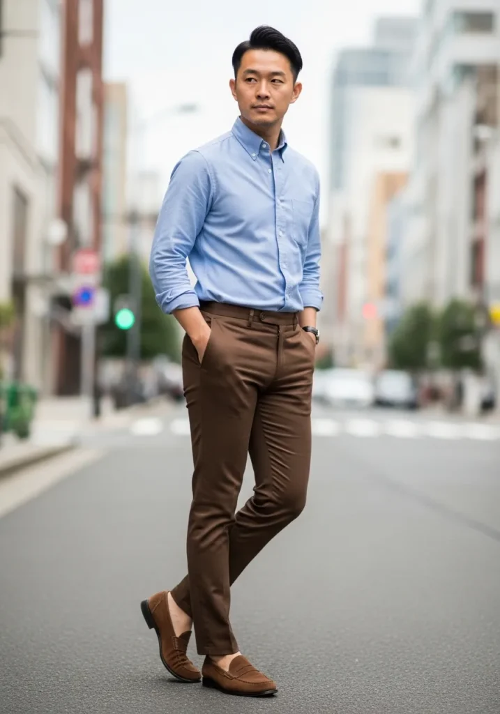 This outfit pairs sleek slim fit brown trousers with a crisp light blue button down shirt tucked in neatly. The fabric of the pants has a smooth finish with subtle structure, giving them that clean tailored feel without looking stiff. Brown suede loafers pull everything together and add warmth that blends perfectly with the trousers. The sleeves are casually rolled which keeps the whole look relaxed and modern instead of overly formal.