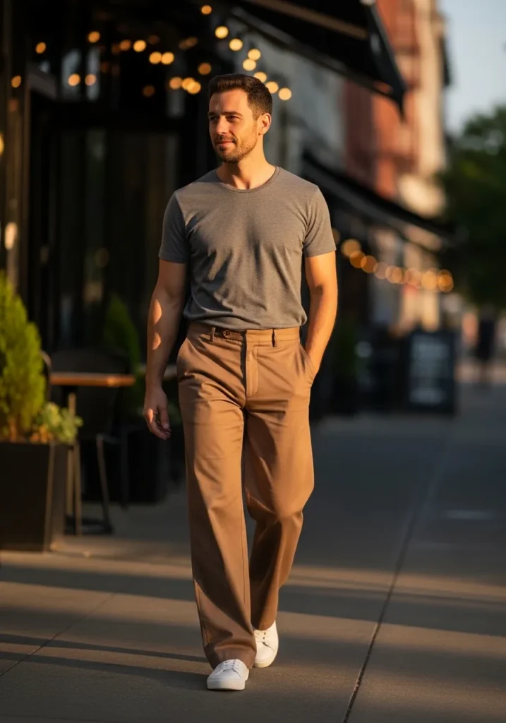 This outfit has that cool effortless vibe that always feels current. He is wearing relaxed brown trousers with a slightly wider leg and soft natural folds that move beautifully as he walks. The fabric drapes in a clean straight line, giving structure without looking stiff. A fitted gray crew neck T shirt keeps the top simple and streamlined. White minimalist sneakers add a fresh contrast and keep everything light and modern.