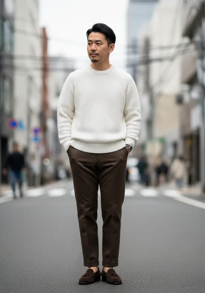 This look feels cozy and refined at the same time. He is wearing rich dark brown trousers tailored close to the leg with a clean cropped hem that shows just a hint of ankle. The fabric has a smooth finish with soft natural folds near the knees. On top, a cream ribbed knit sweater adds texture and warmth without looking bulky. Dark brown suede loafers tie everything together in a tonal and polished way.
