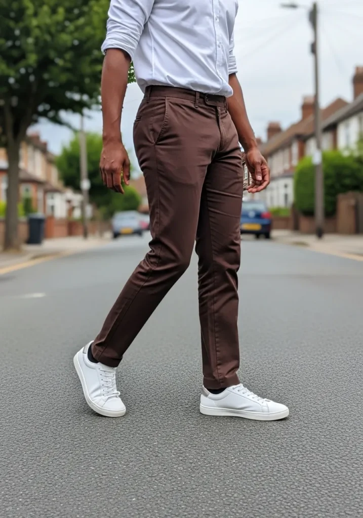Cropped Brown Pants with Fresh White Sneakers
