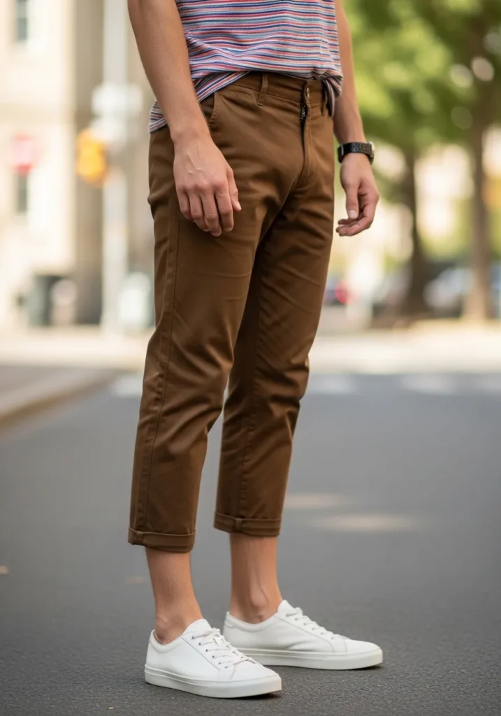 This look is all about relaxed confidence. The brown pants are slim and slightly cropped with a neat cuff at the ankle, showing just a hint of skin for that modern touch. The fabric has a smooth finish with soft natural folds around the knees, which keeps it feeling real and wearable. A striped casual T shirt tucked loosely at the waist adds a playful detail, while clean white low top sneakers keep everything sharp and minimal.