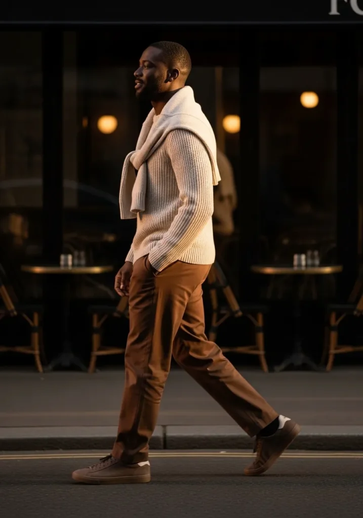 This outfit leans into warm tones in the best way. He is wearing tailored brown trousers with a clean straight fit that skims the leg without clinging. The fabric looks structured yet comfortable, with soft natural folds as he walks. On top, a textured beige knit sweater adds depth, and a light cream layer is casually draped over his shoulders for that relaxed European feel. Brown leather sneakers ground the look and keep it modern instead of dressy.